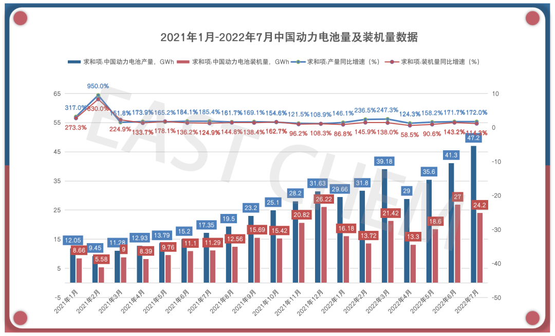 2022年1-7月 我国动力电池累计产量253.7GWh,累计同比增长175.6%。
