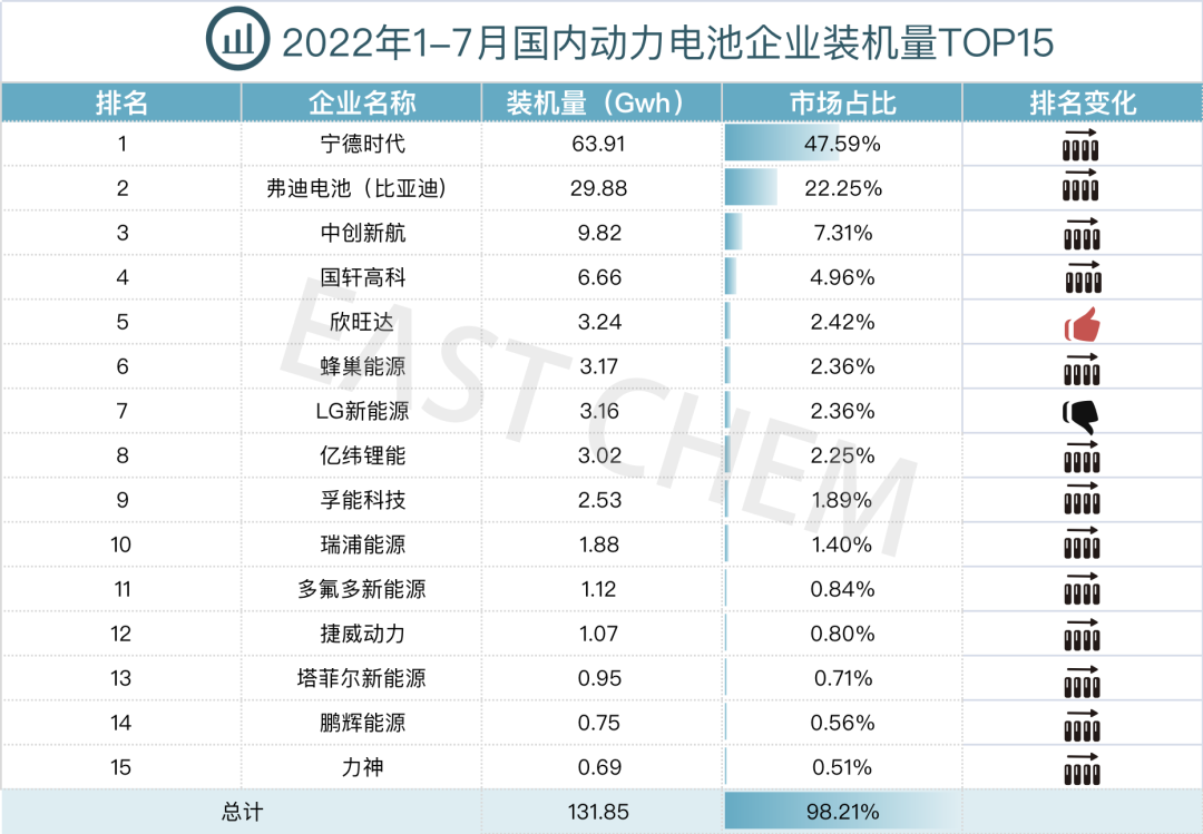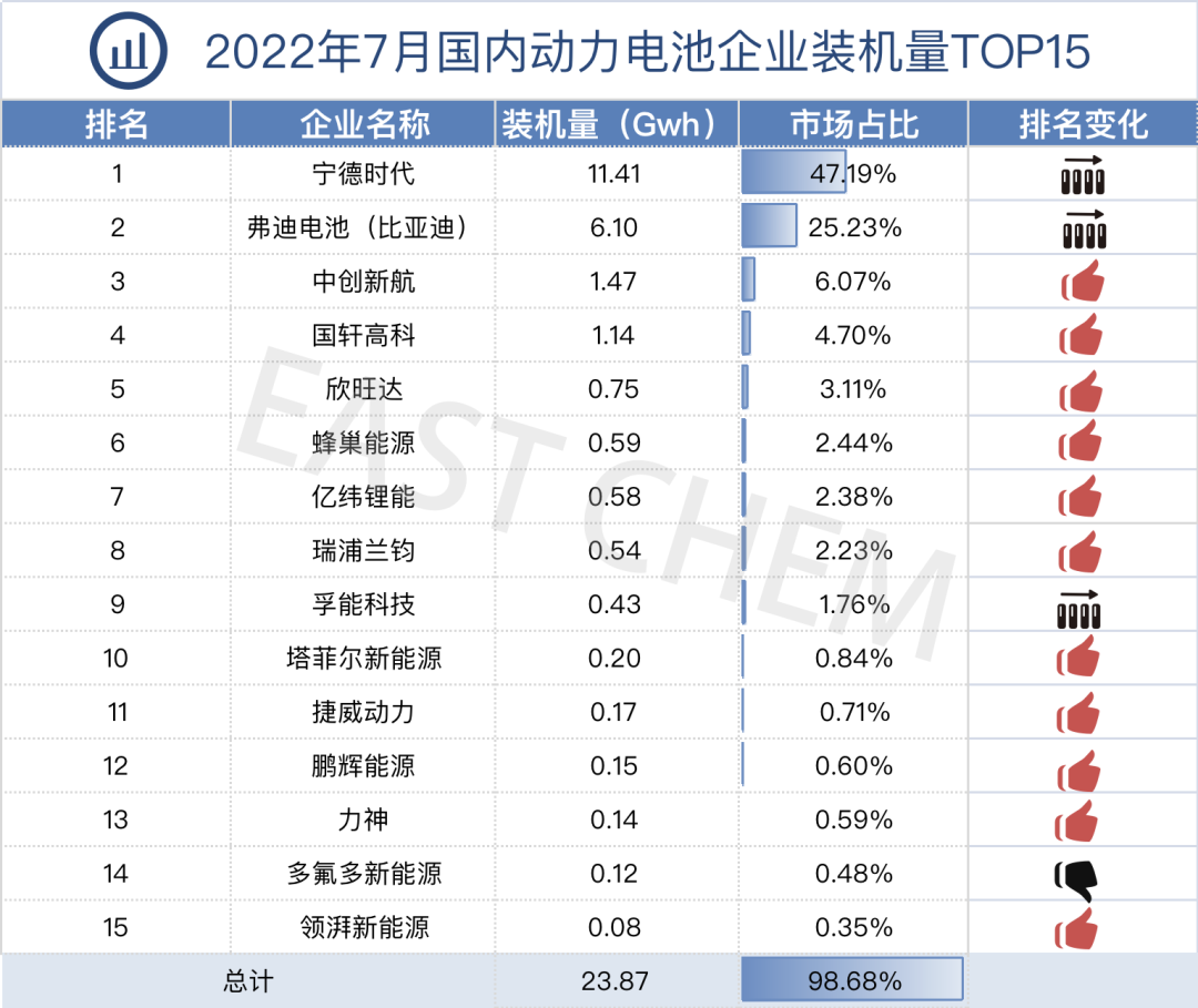 2022年7月 国内动力电池企业装机量TOP15的企业如下