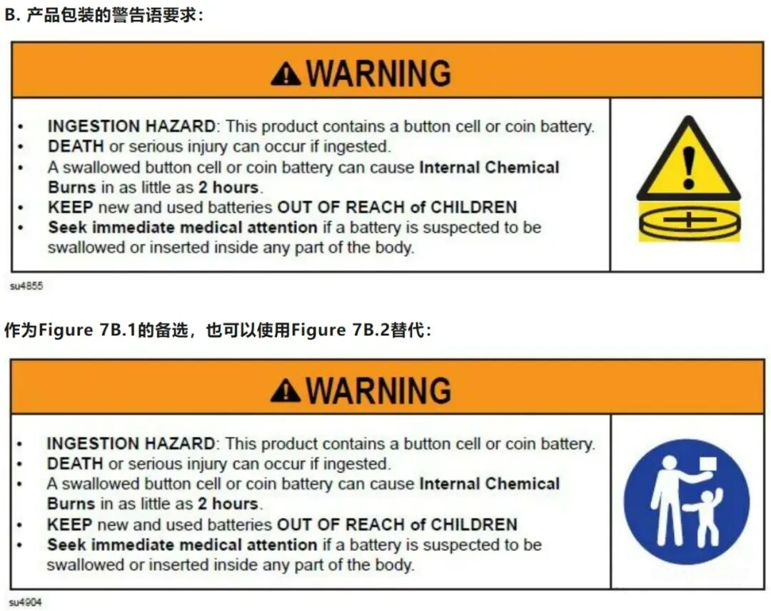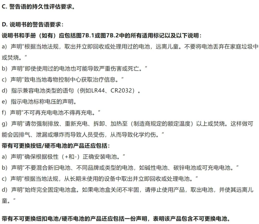 使用纽扣电池/硬币电池的产品应设计为将儿童取出、摄入或吸入电池的风险降至最低。电池仓必须固定,以便它们需要使用工具或至少两个独立且同时的手部动作才能打开,并且这个两个打开动作不可由一个手指合并在一个动作完成。并且在进行性能测试后,蓄电池室门/盖不得打开,且应保持功能。电池应不可接近。