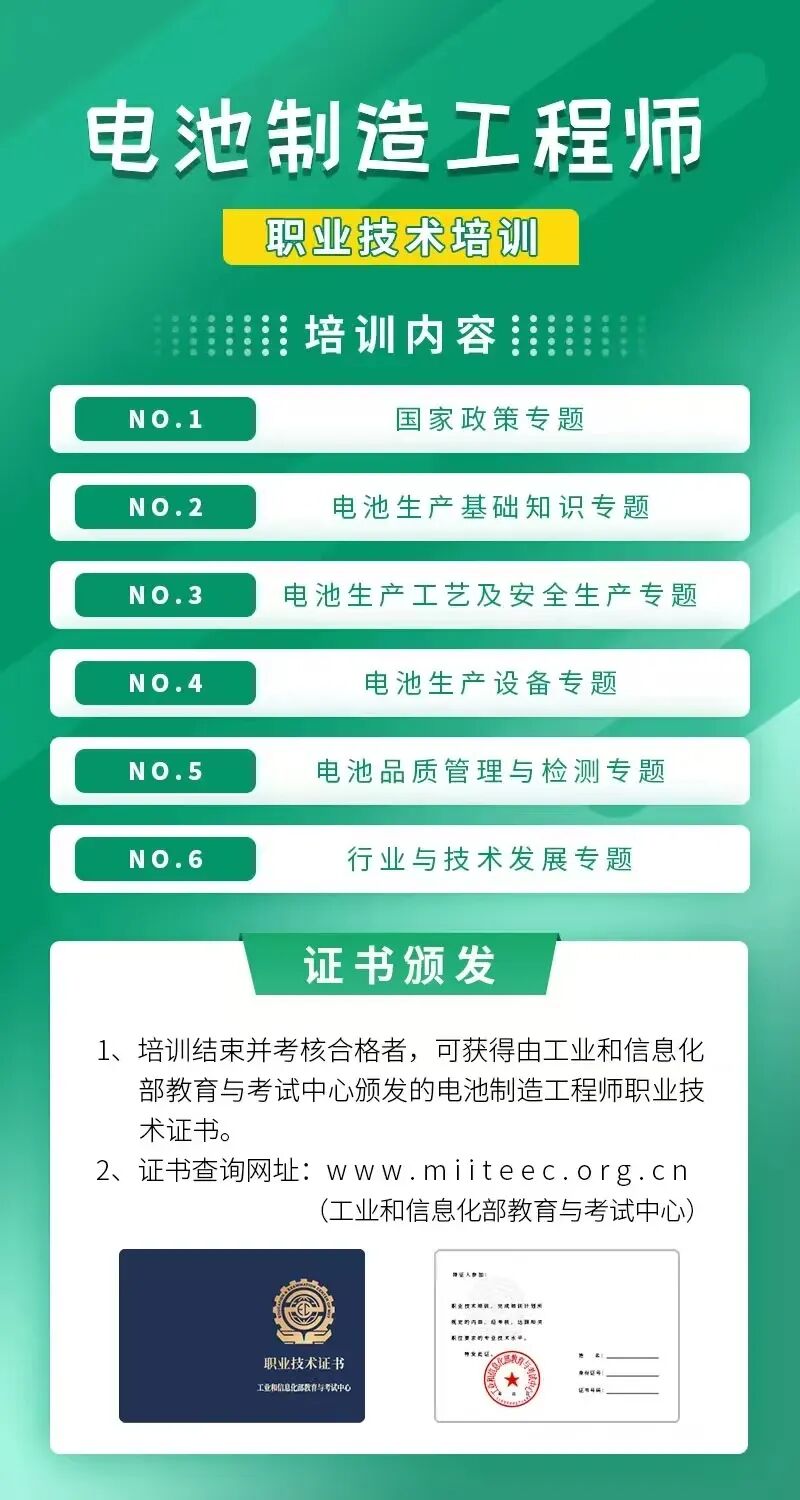 1、培训结束并考核合格者,可获得由工业和信息化部教育与考试中心颁发的电池制造工程师职业技术证书。