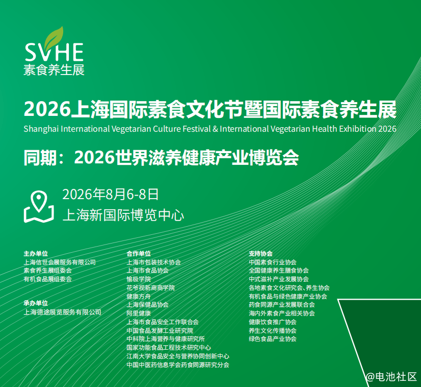 电池社区讯:近日,2026上海国际素食文化节暨国际素食养生展在上海新国际博览中心盛大启幕,展会为期3天(8月6日—8日),同期联动第九届世界滋养健康产业博览会,以“天然素食·滋养健康”为核心主题,打造集产品展示、健康科普、体验互动于一体的专业平台。对于长期奋战在电池研发、生产、回收一线的从业者而言,这场展会更是一份专属健康福利,精准匹配电池行业职业健康需求,助力电池人摆脱亚健康困扰,以更充沛的状态投身行业发展。